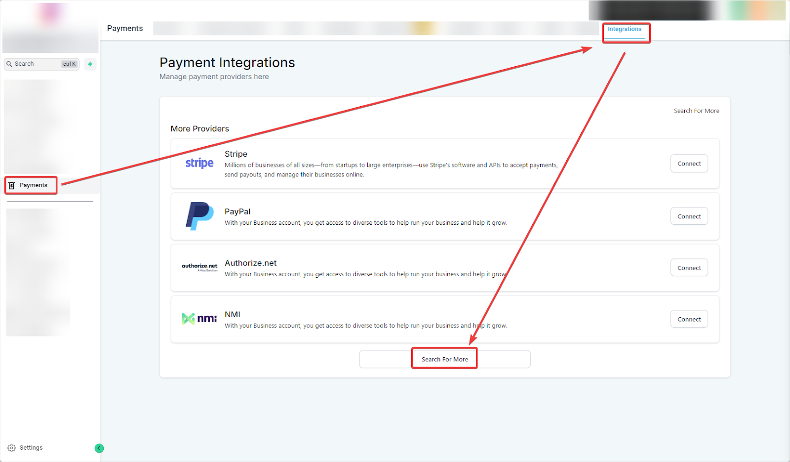 - If you haven’t already integrated your Shopify store, navigate to Payments > Integrations.