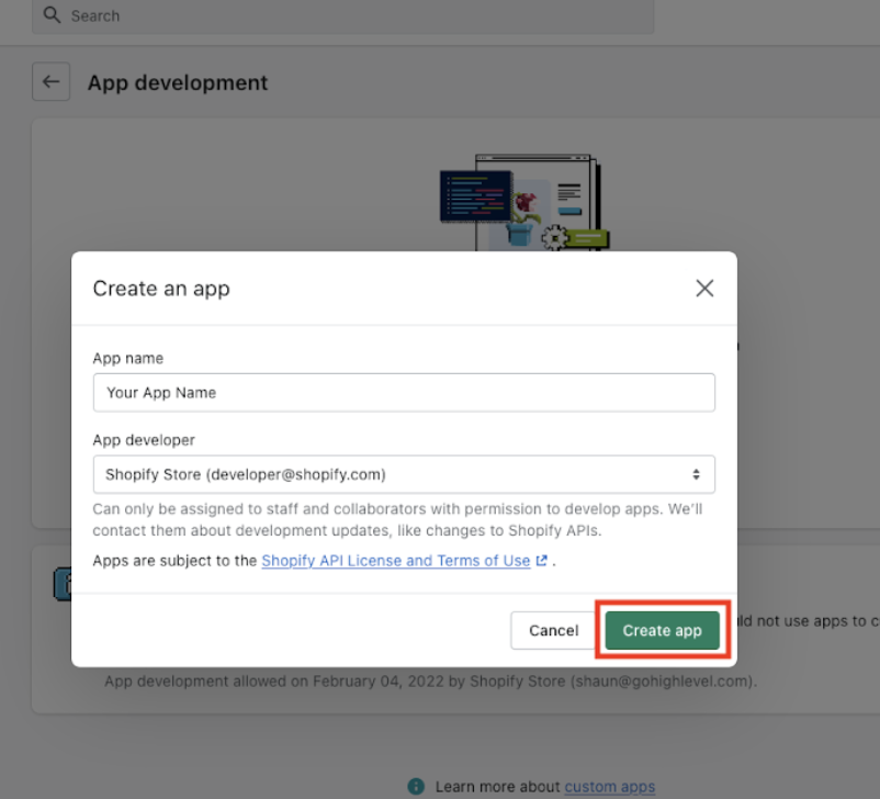 2. Enter a name for your app, such as “My App” or “Sally’s Shopify Store,” and enter your email address in the appropriate field.