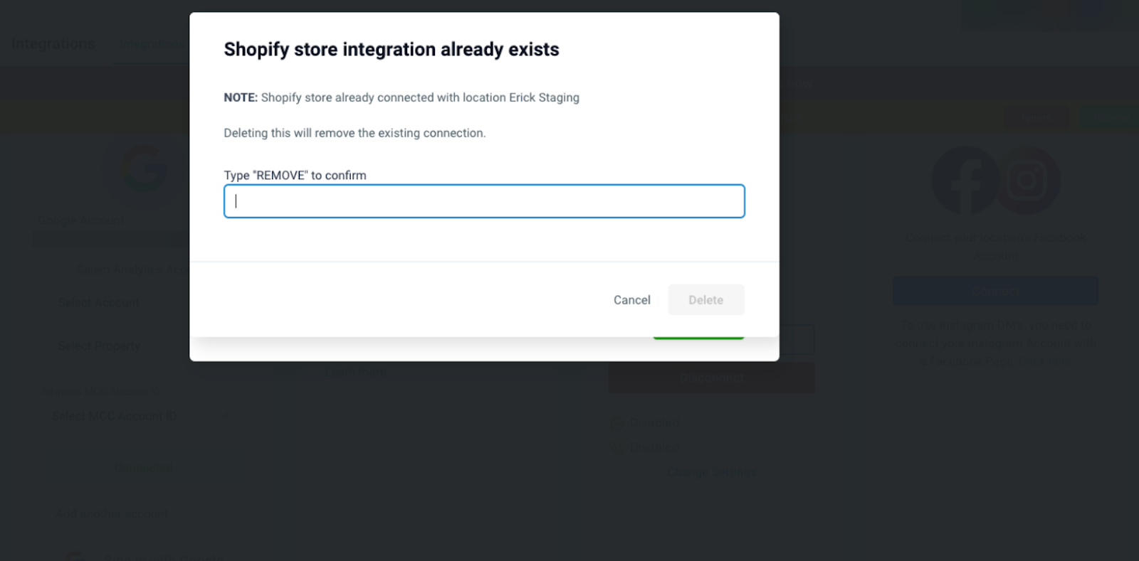 2. If the store is already integrated, an option will appear to remove the current integration and re-integrate it to the desired location.