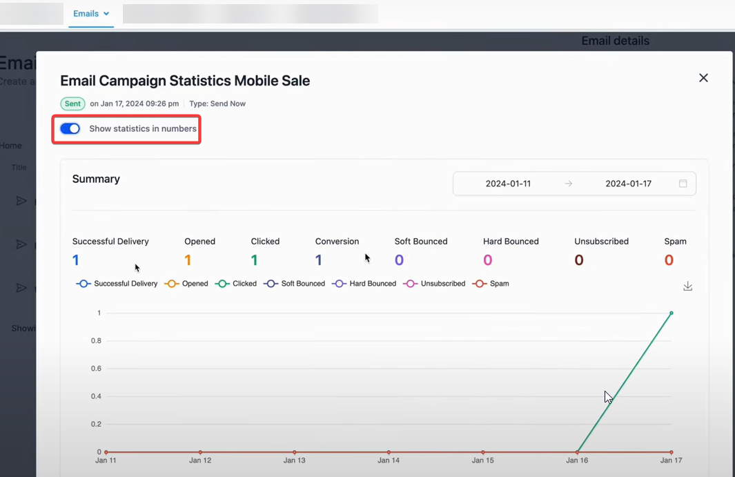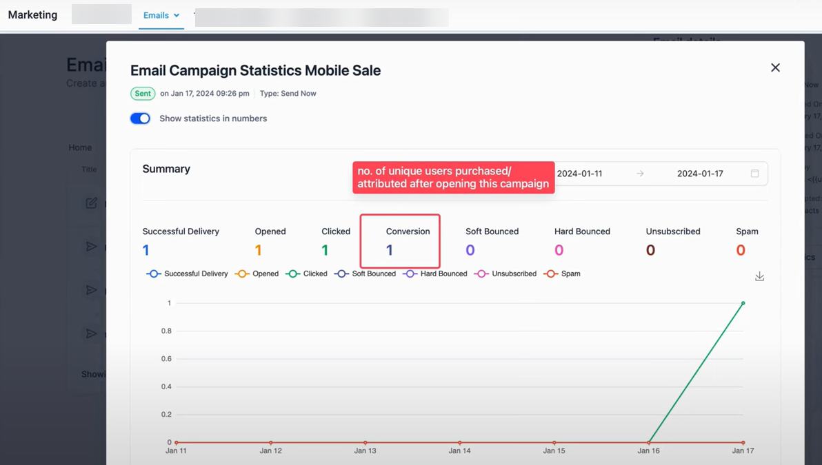 - In the Email Campaign Statistics, scroll to the “Conversion Metrics” section.